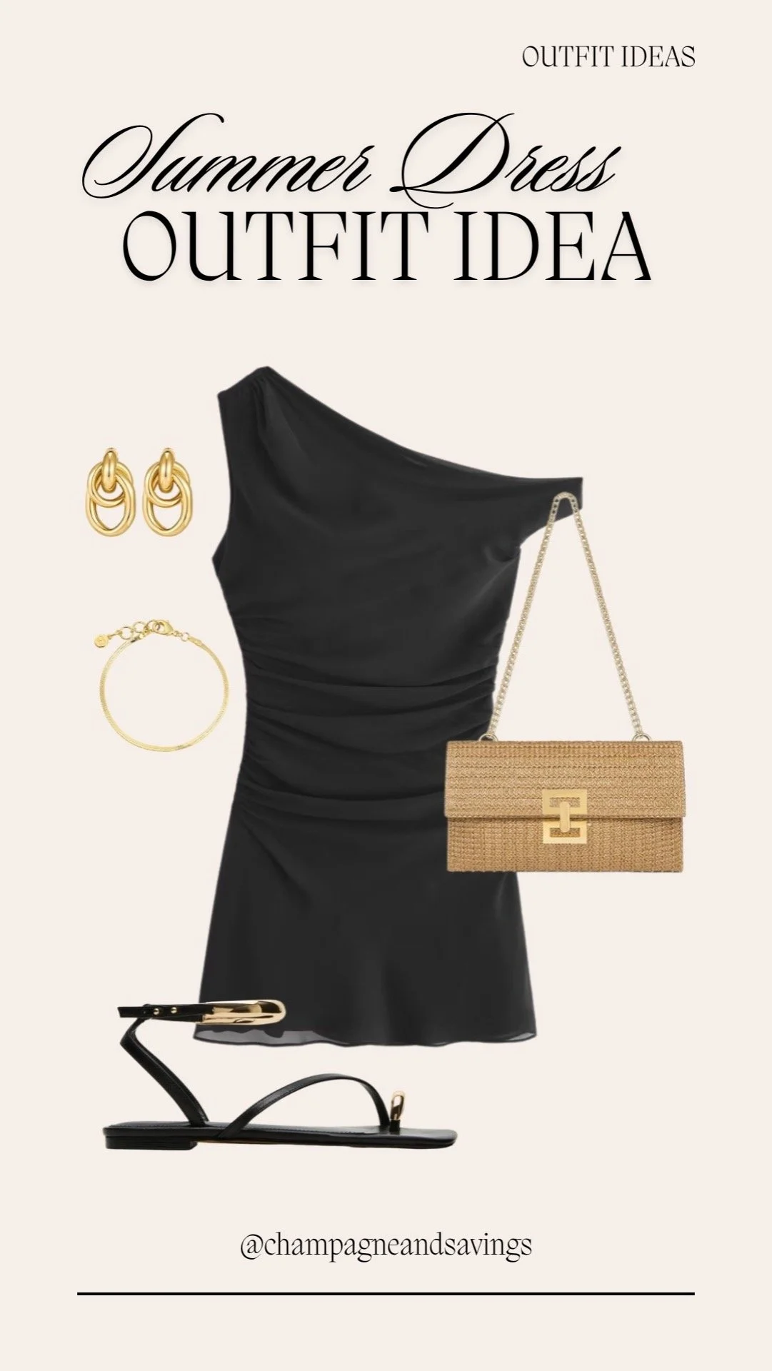 Off The Shoulder Black Mini Dress Outfit: Yet another fun LBD moment, because itโs just so fun to do in the summer! Such a chic and sexy look, especially with this off the shoulder / asymmetric neckline that is a summer 2025 fashion trend!
