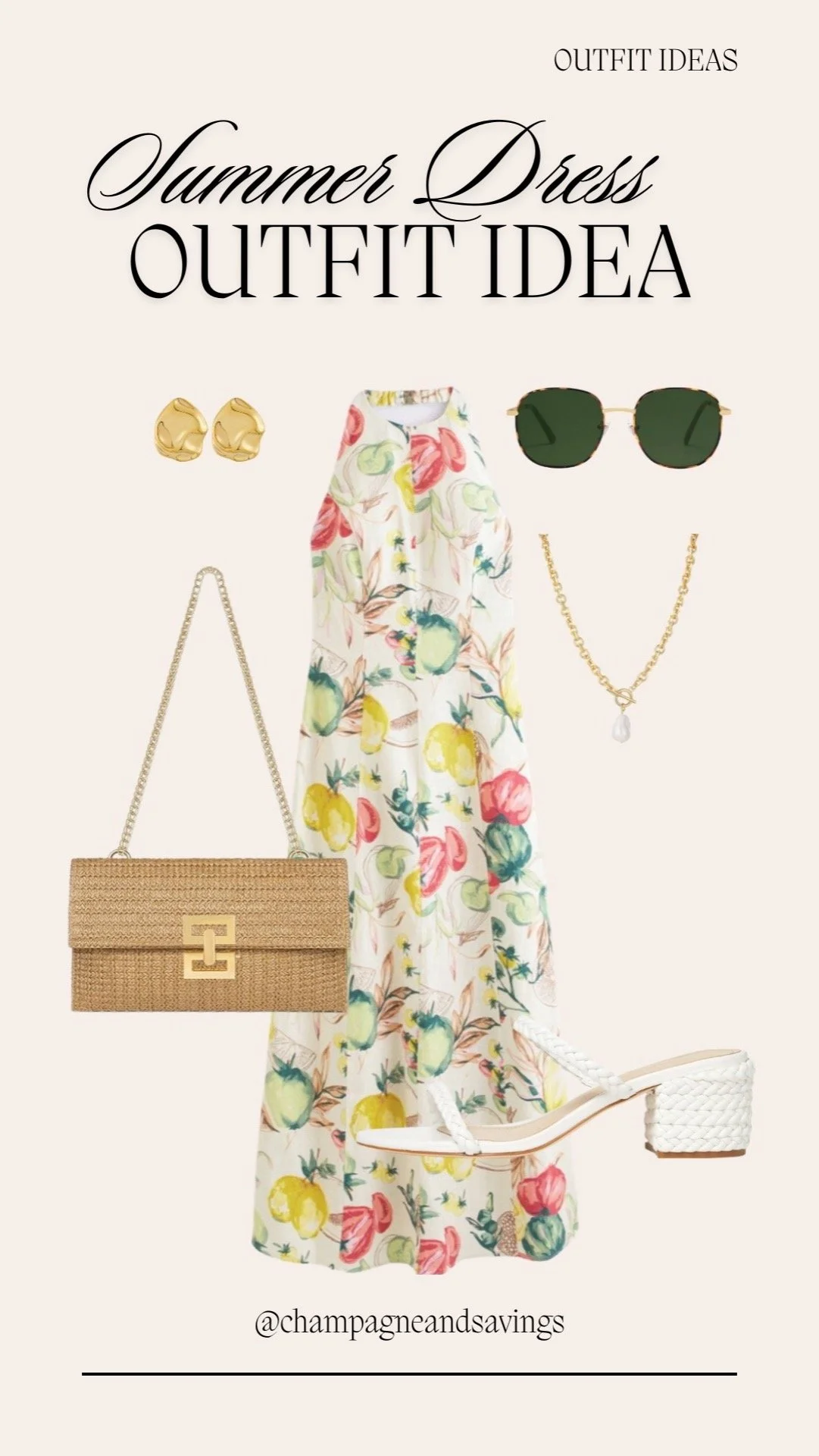 Kitschy Print Halter Dress Outfit: I love this adorable print and the halter neck. Itโs such a vibe for going out to dinner on vacation.