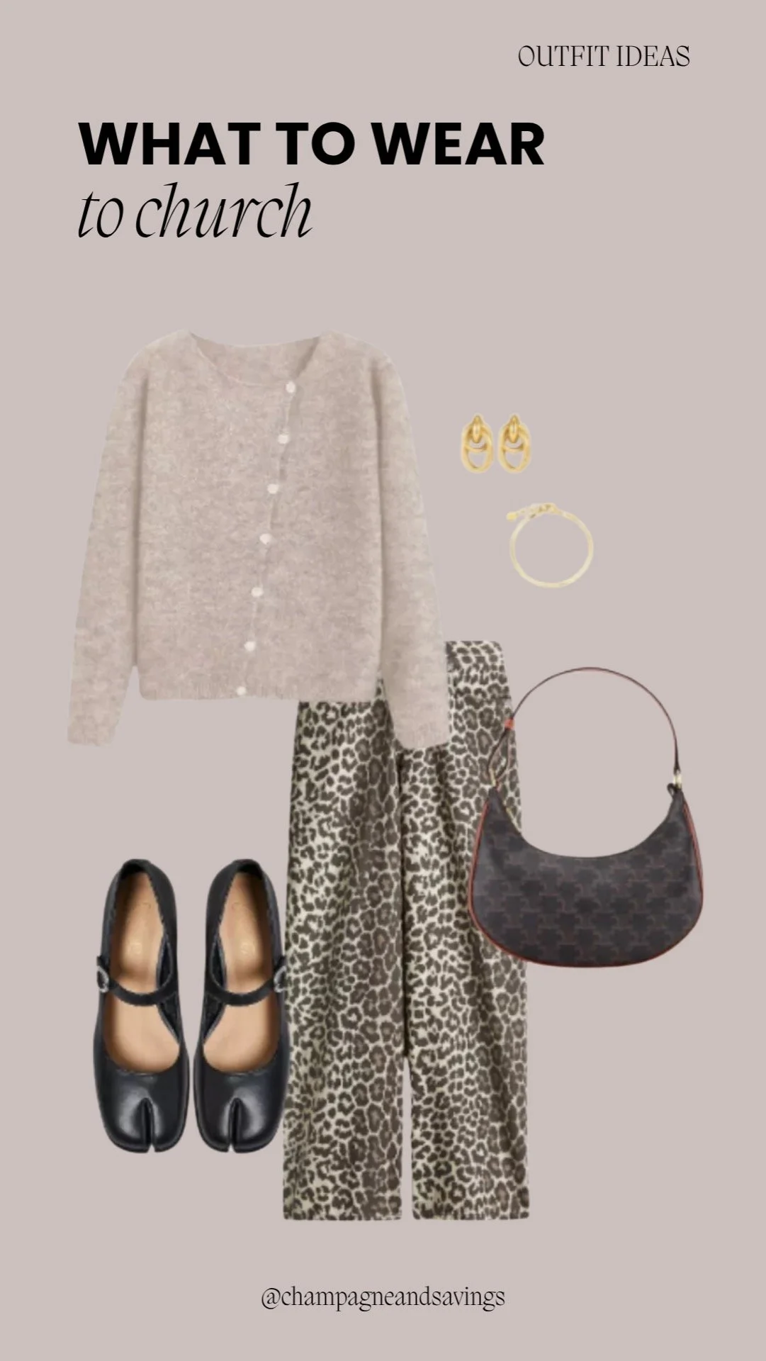 So fun with the leopard pants, and yet it feels so simple. This look is perfect for church. Itβs classy with a pop of fun and definitely modest enough for a place of worship.