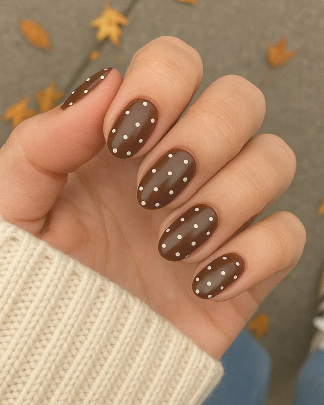 Cute alert! These nails are giving sweet and stylish. The little white dots on a deep brown base just work. They give vintage vibes in the best way. If you’re not into nail art that’s too loud, this one keeps it low-key but still fun. Pair it with a tan sweater and you’re good to go.