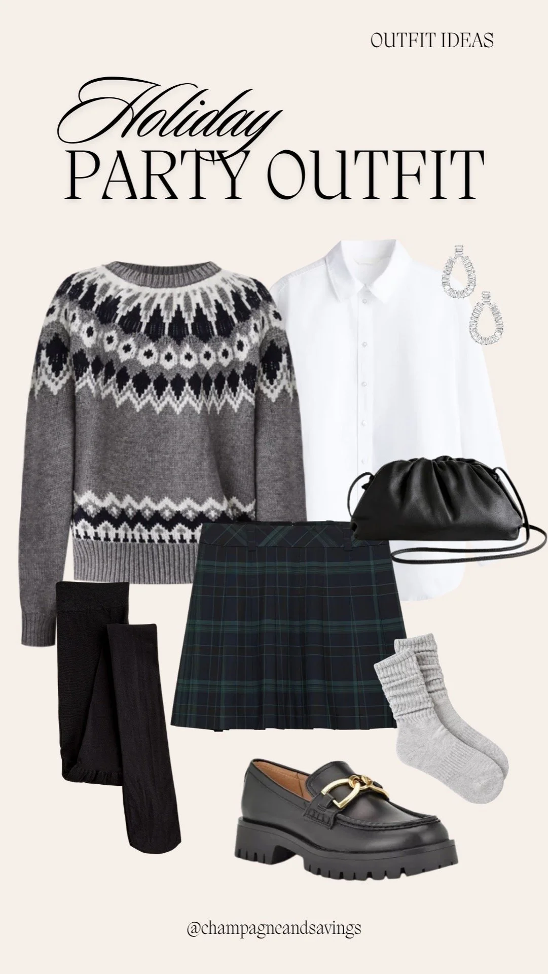 This one’s giving cool girl Christmas. Pairing chunky knits with a skirt just works. Add tights, cozy socks, and loafers to make it cold-weather friendly. A button-up under the sweater makes it feel extra preppy.