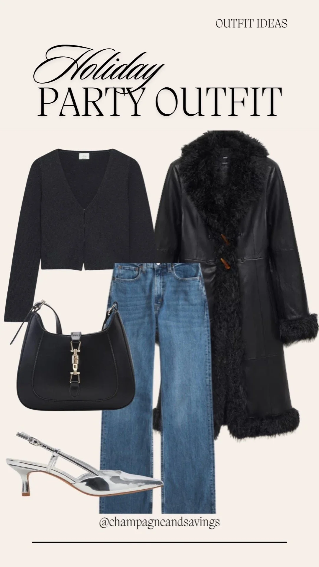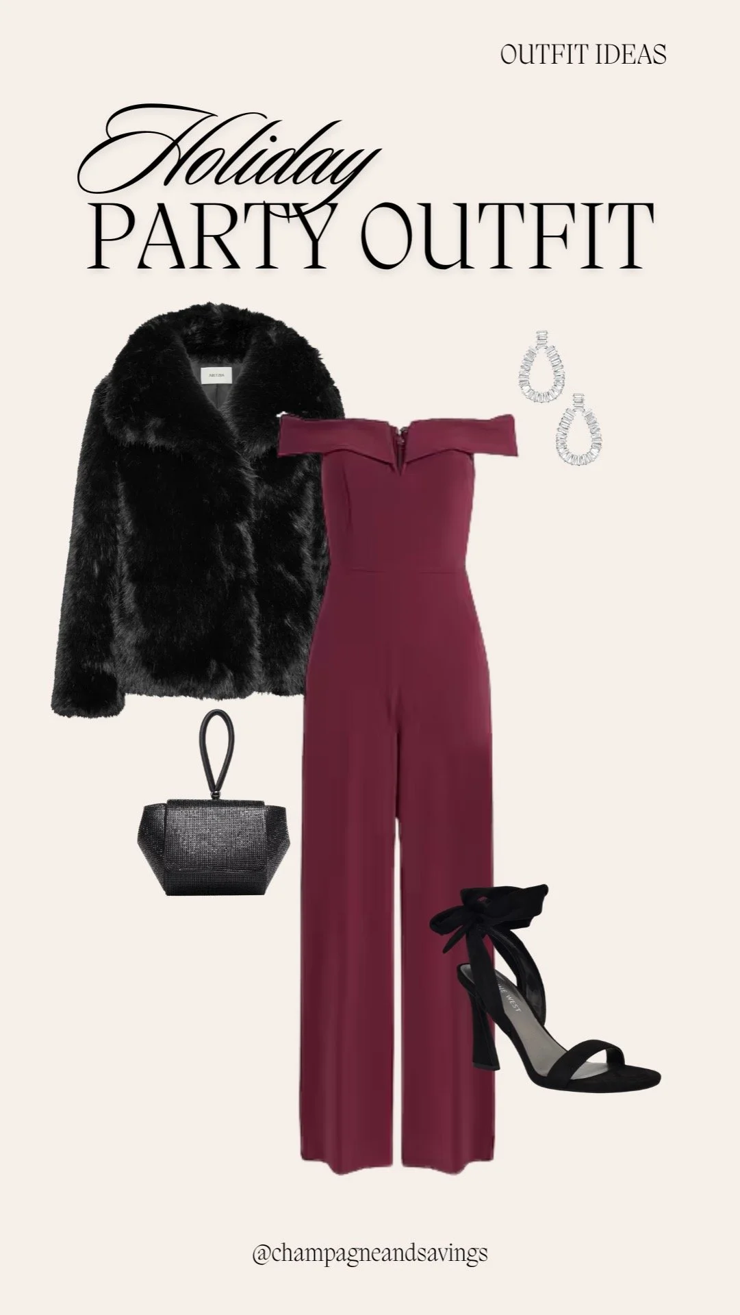 The glam girl option. That jumpsuit is a showstopper. Pairing it with a faux fur jacket adds drama. Add sparkle heels and bold earrings to finish it off.