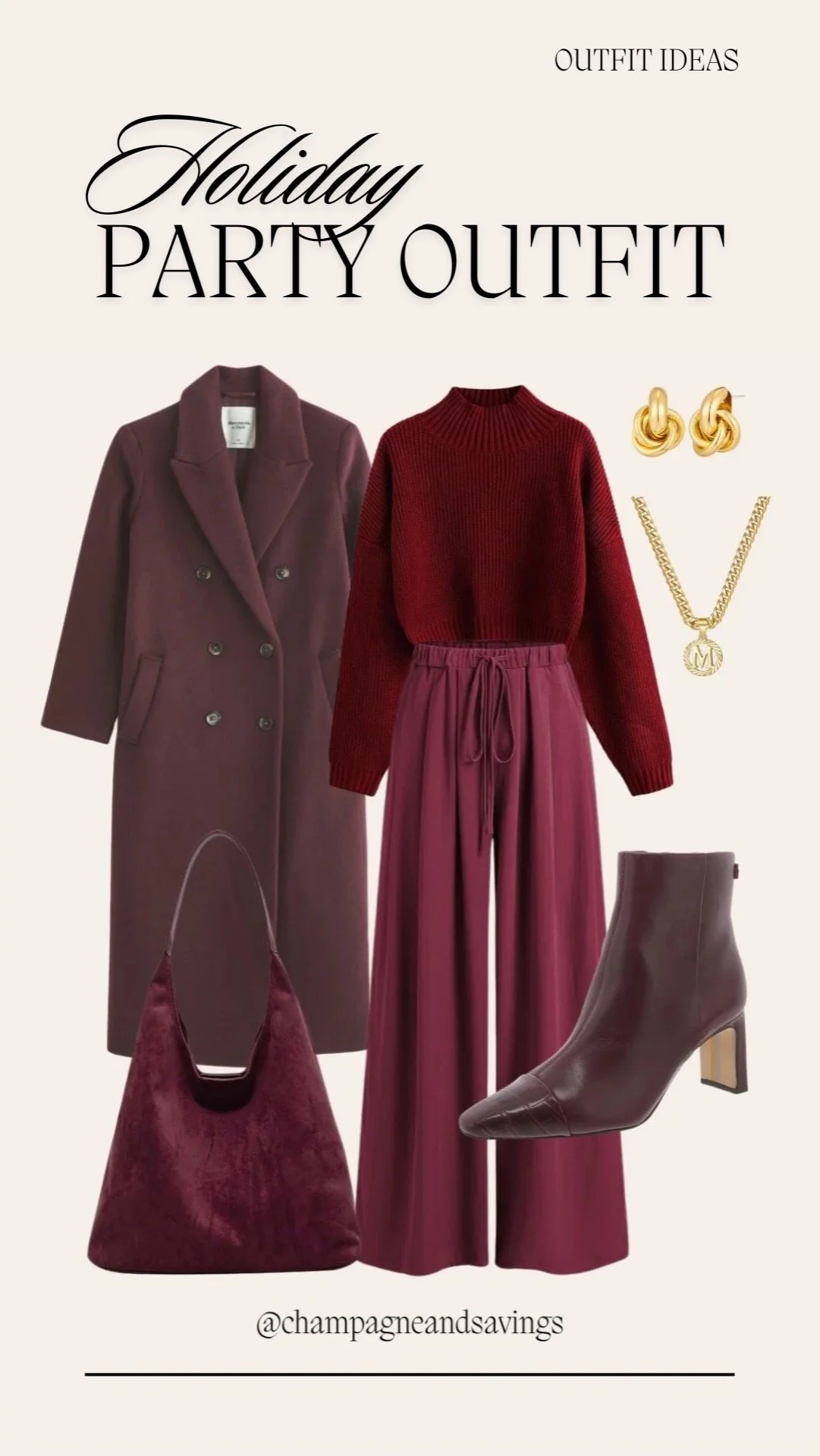 You can’t go wrong with head-to-toe burgundy. So festive but still easy to wear. This look mixes texture with knits and suede, which adds depth. Finish with gold jewelry to warm it up.
