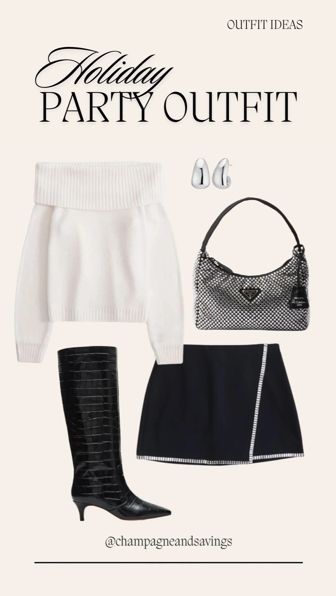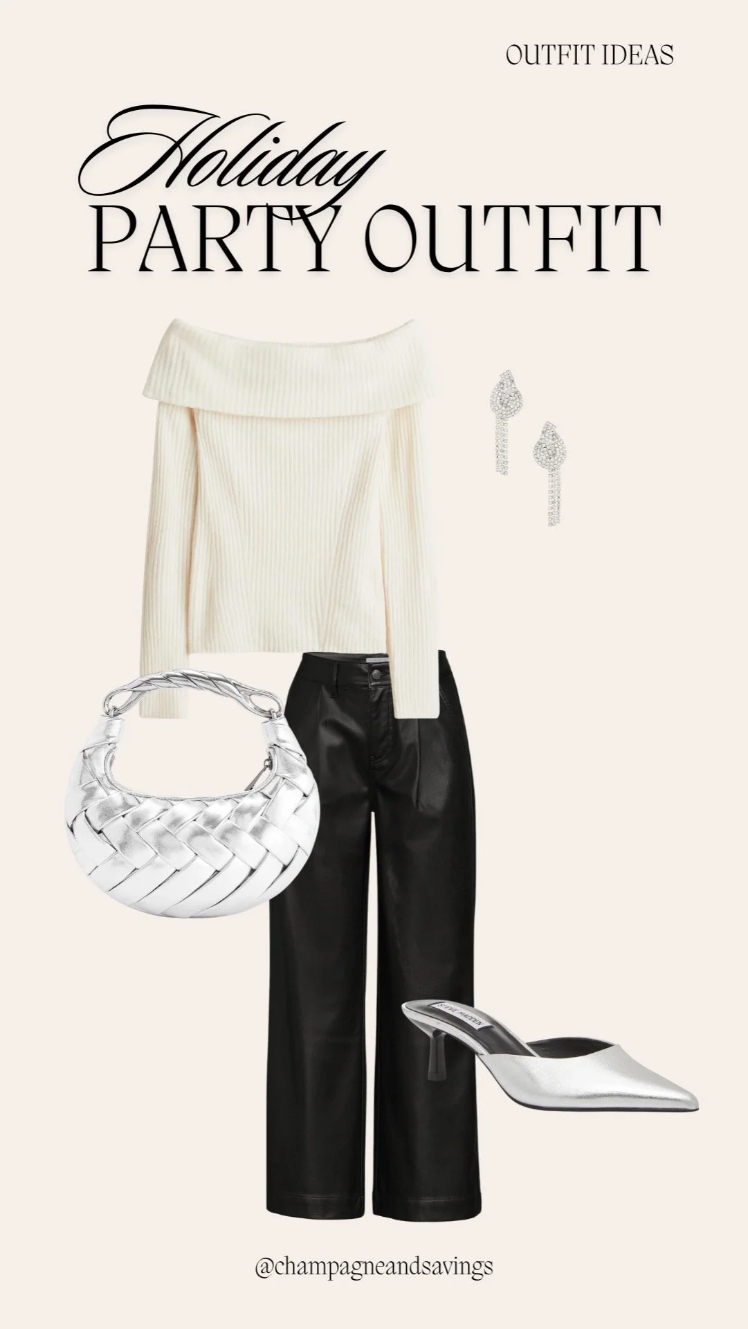 This look is cozy but still feels dressy. The off-the-shoulder detail makes it flirty without trying too hard. Pair it with black leather pants to give it a little edge. Add silver heels and a metallic bag to dress it up.