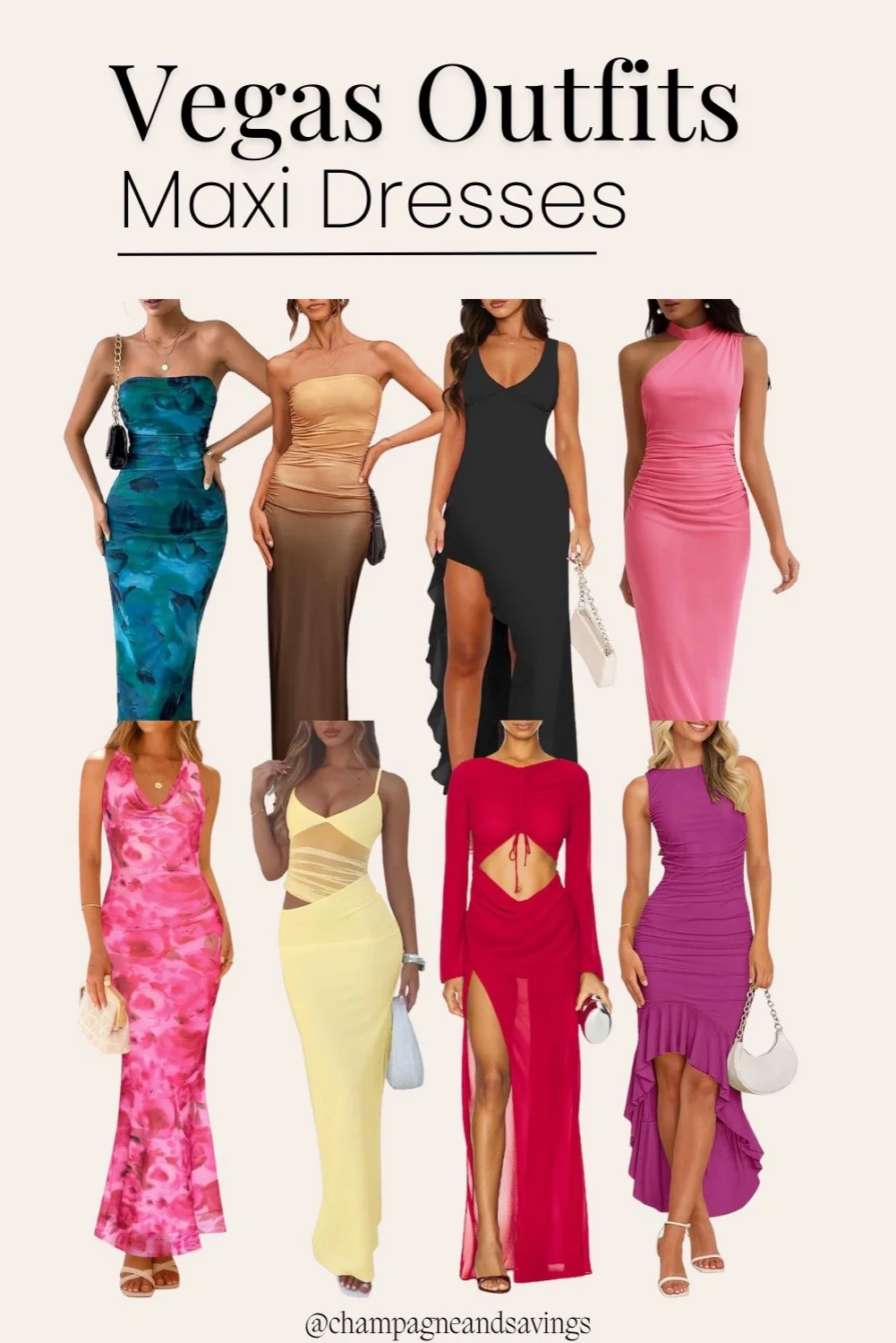 I personally wore a bodycon maxi dress to my cousin’s bachelorette party in Vegas and it was honestly perfect for both dinner and the club. We are millennials so we like, actually throw our hands in the air like we just don’t care and DANCE, so a mini dress just wasn’t gonna be in the cards for me! Love all these options for a fun Vegas night out.