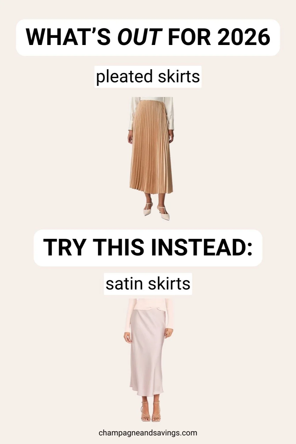 Pleated skirts seem to be on the outs! The pleated tennis skirt and pleated midi skirt I am seeing less and less of. The big skirt trend I am seeing is satin. From minis to maxis, satin is a safe bet if you’re looking for a similar sort of classy vibe that the pleated skirt gives. TBH I never loved the pleated skirt trend because it was annoying to de-wrinkle those pleats once they got messed up!