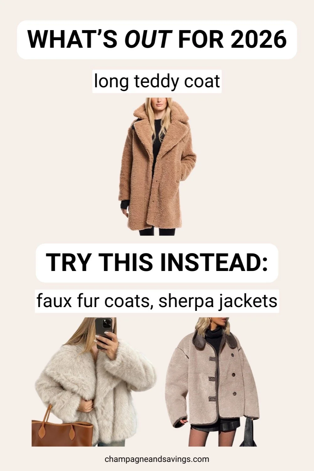 The long teddy coat trend was huge, but now it’s been replaced by faux fur coats. A very close second is the sherpa / moto style funnel neck jacket that is very popular right now but has very similar vibes to the teddy coat of a few years ago.