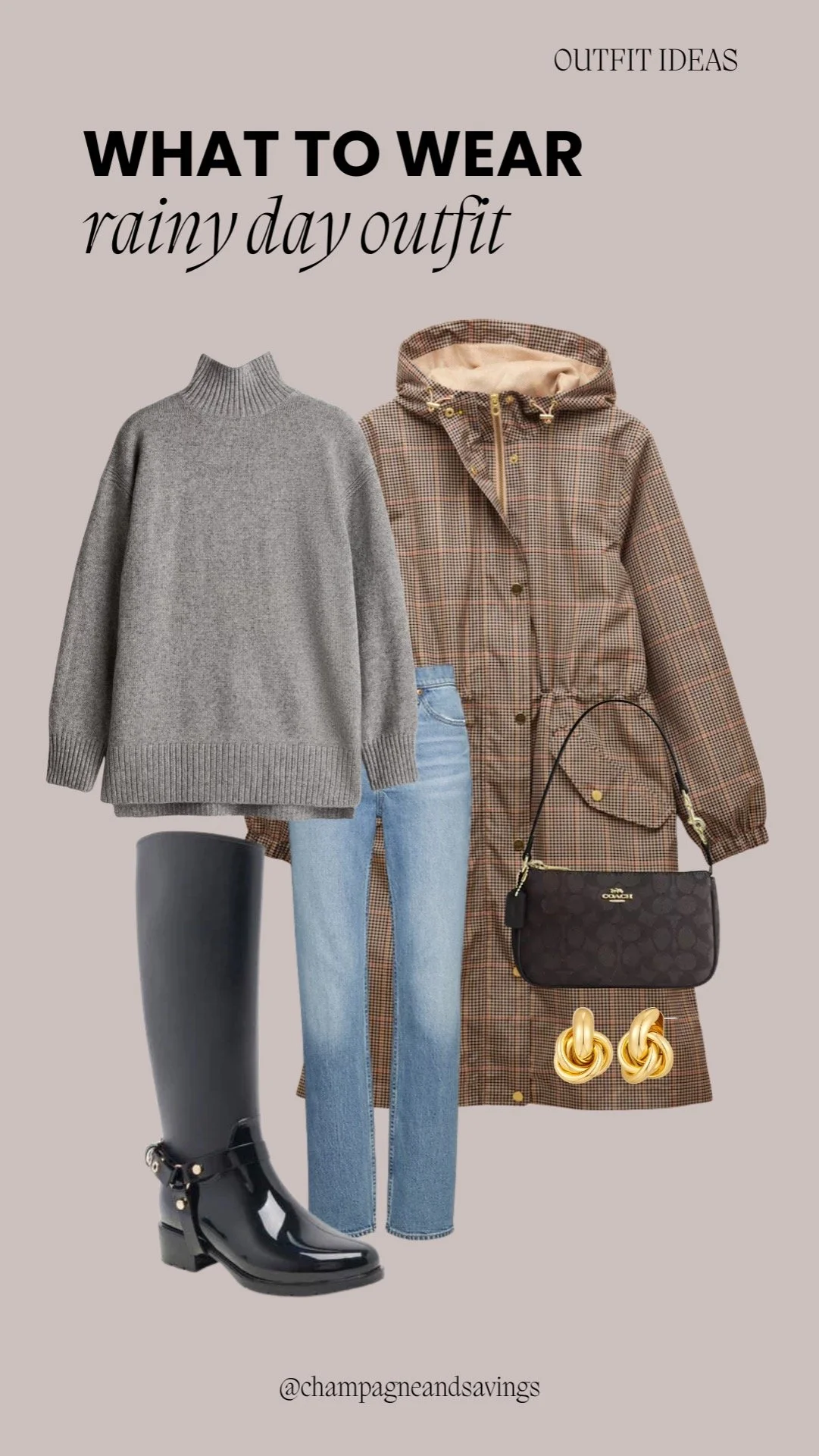 This one is for real rainy days. Like stormy, puddles-everywhere days. Tall boots are a must. The plaid coat makes it feel classic.