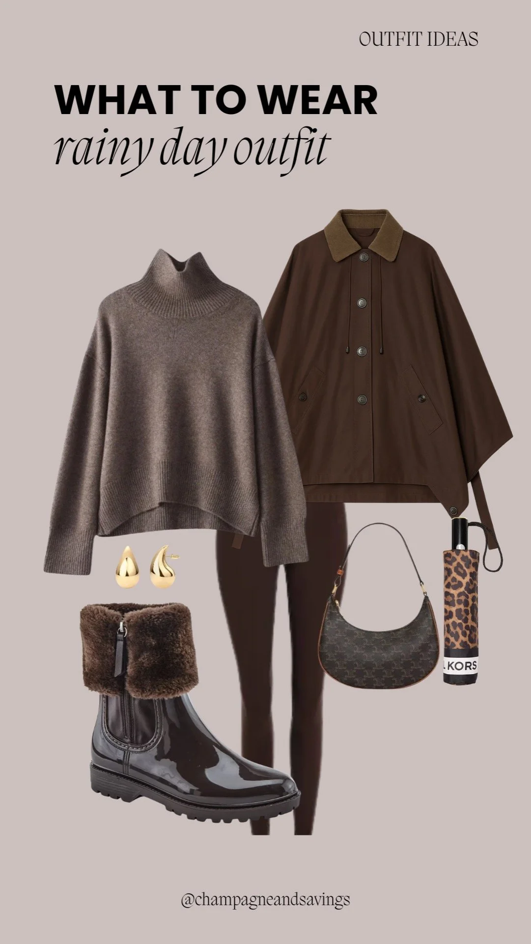 Brown Turtleneck + Cape Jacket + Sherpa Rain Boots
