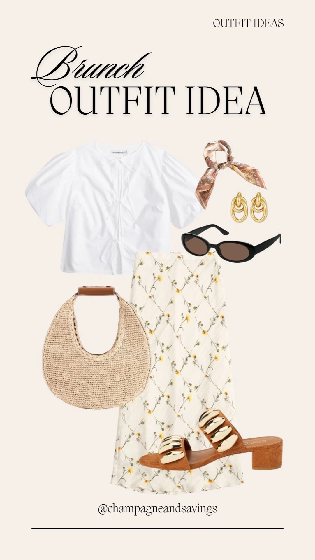 A cute floral midi skirt and a tie-front blouse? Sign me up. The fun accessories also add to this chic little brunch fit.