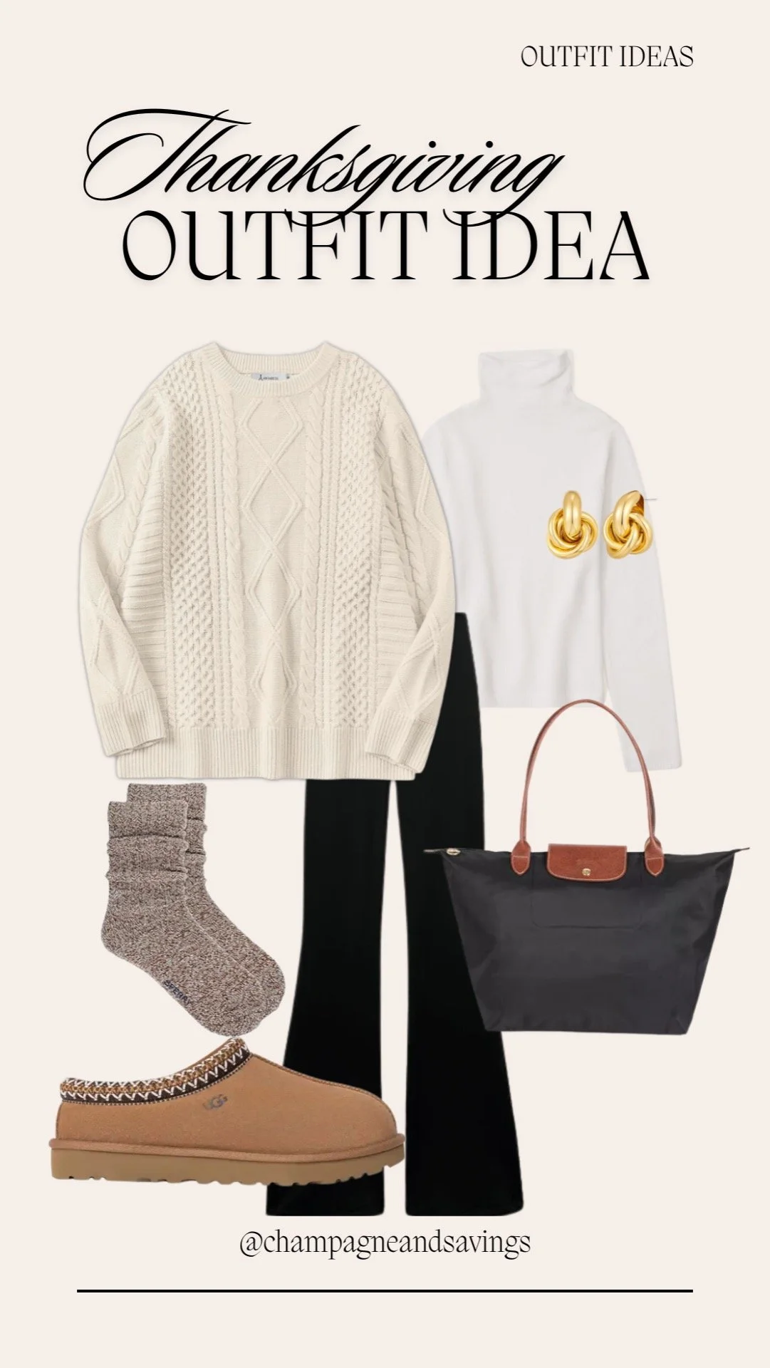 Can’t go wrong with a chunky sweater. Pair it with black flared pants and UGG slippers for that perfect mix of effort and ease. Bonus: the socks make it extra cozy.