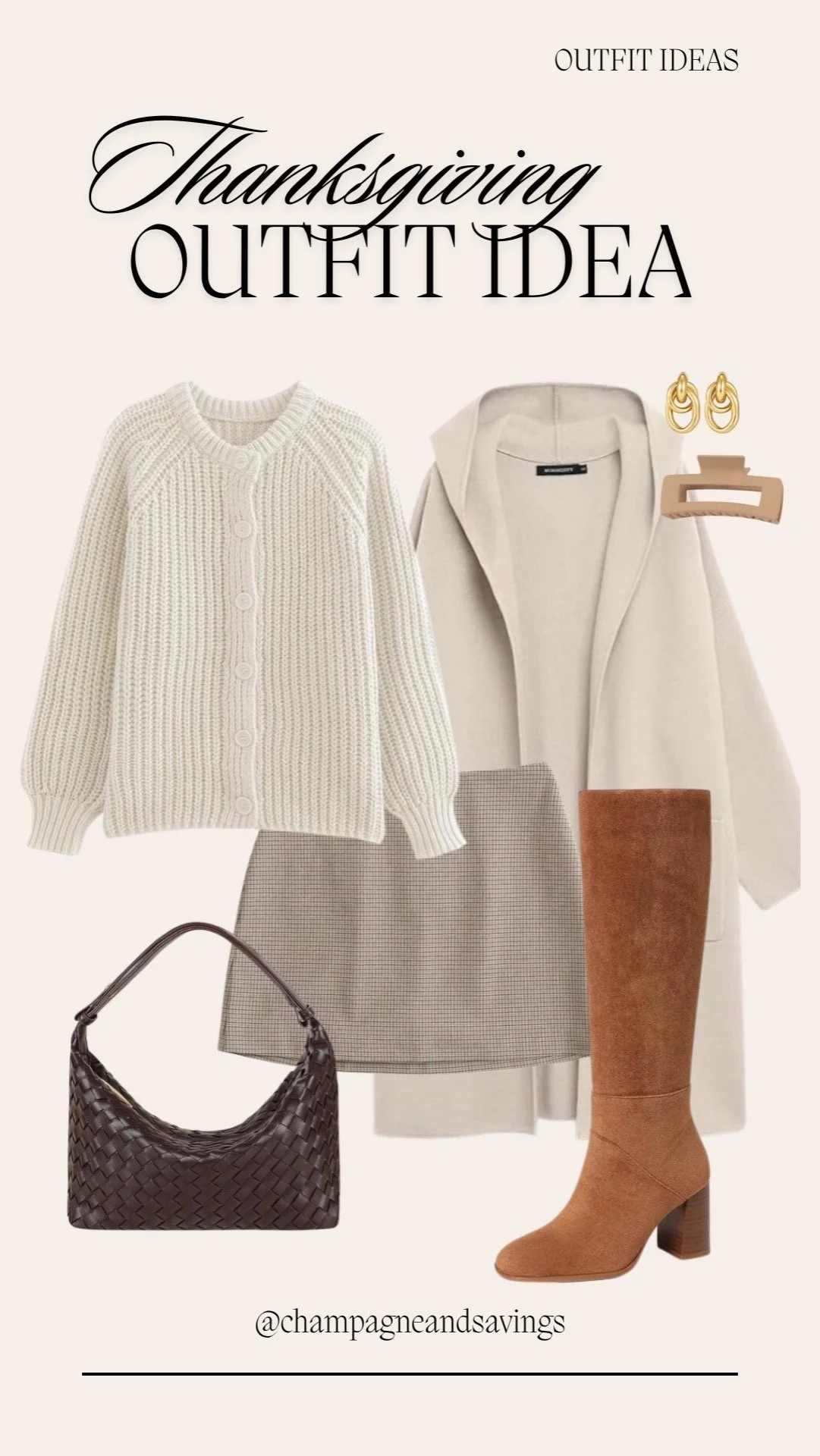 Cream-on-cream is always a win for fall. This cozy combo with the knit cardigan and neutral mini skirt is Thanksgiving perfection. The tall boots make it feel a little extra in the best way.