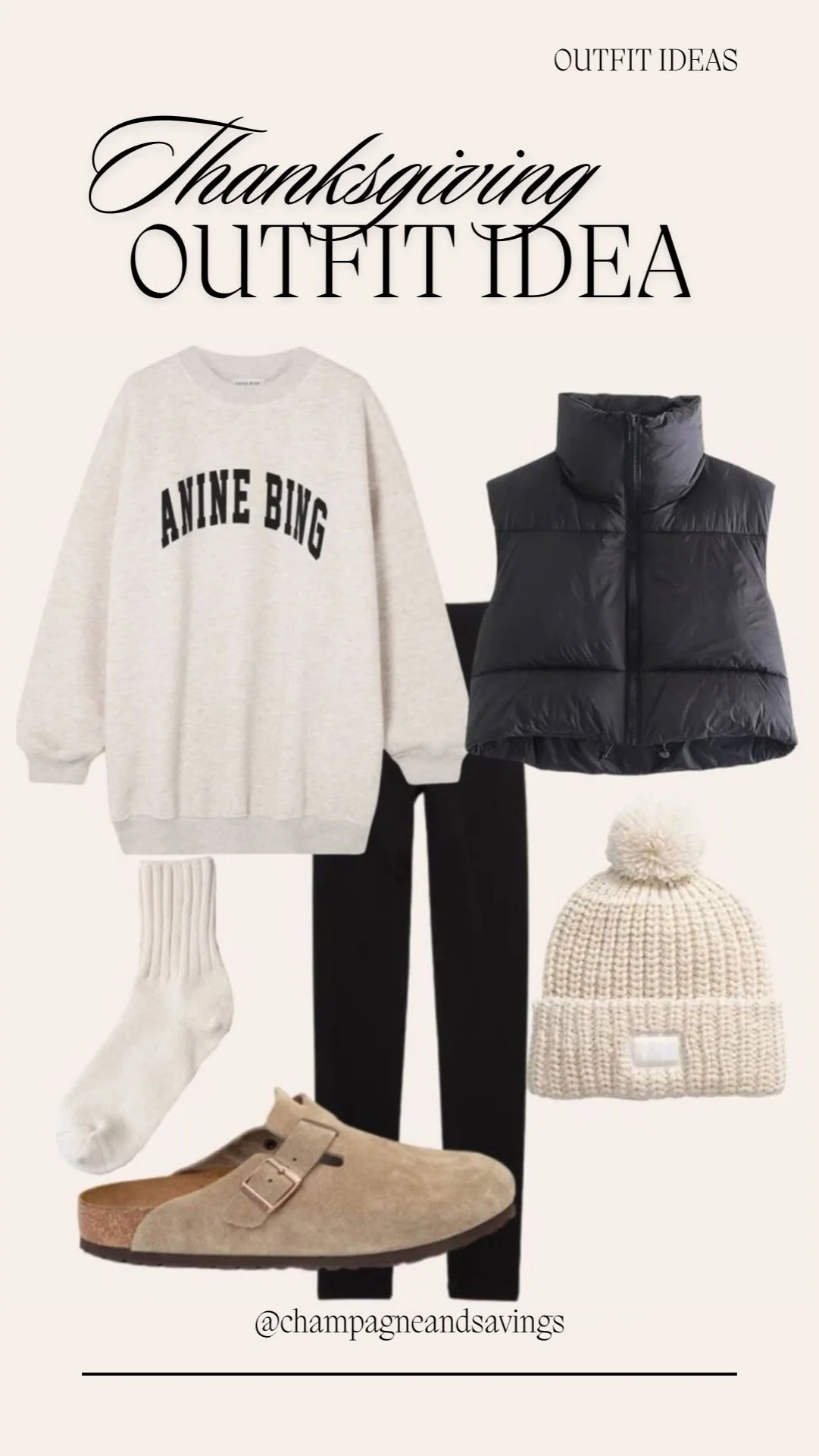 Running around or helping cook? Go for leggings, an oversized sweatshirt, and a puffer vest. Birks and a beanie make it feel trendy but still super chill.