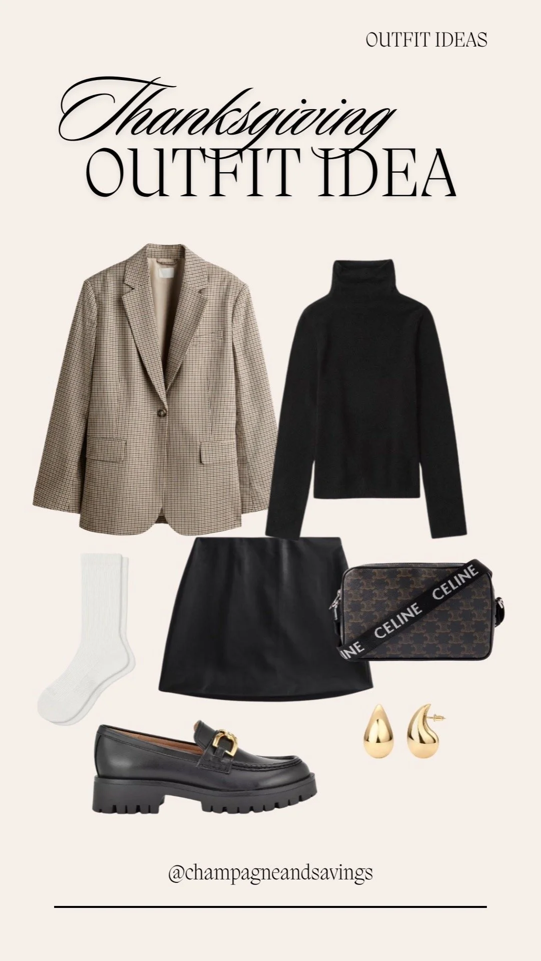 If your Thanksgiving is a little dressier, this look is perfect. A plaid blazer over a turtleneck and mini skirt feels festive but not fussy. Loafers with socks keep it comfy but cute.
