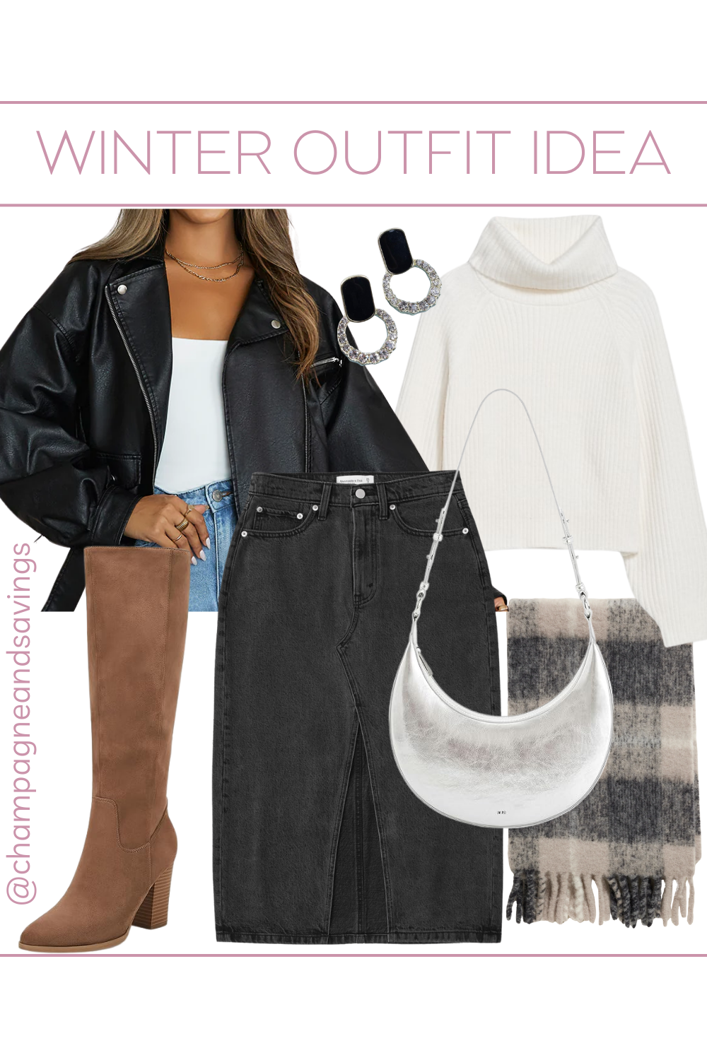Because it’s on trend and can be worn for so many occasions- date night, winter or holiday party, casual Friday, winter concert- you name it! It’s so fun styling the midi denim skirt trend, and love this version in black paired with a leather jacket and tall boots. Winter-fy it with the silver handbag and jewlery and add a scarf if it’s extra chilly.